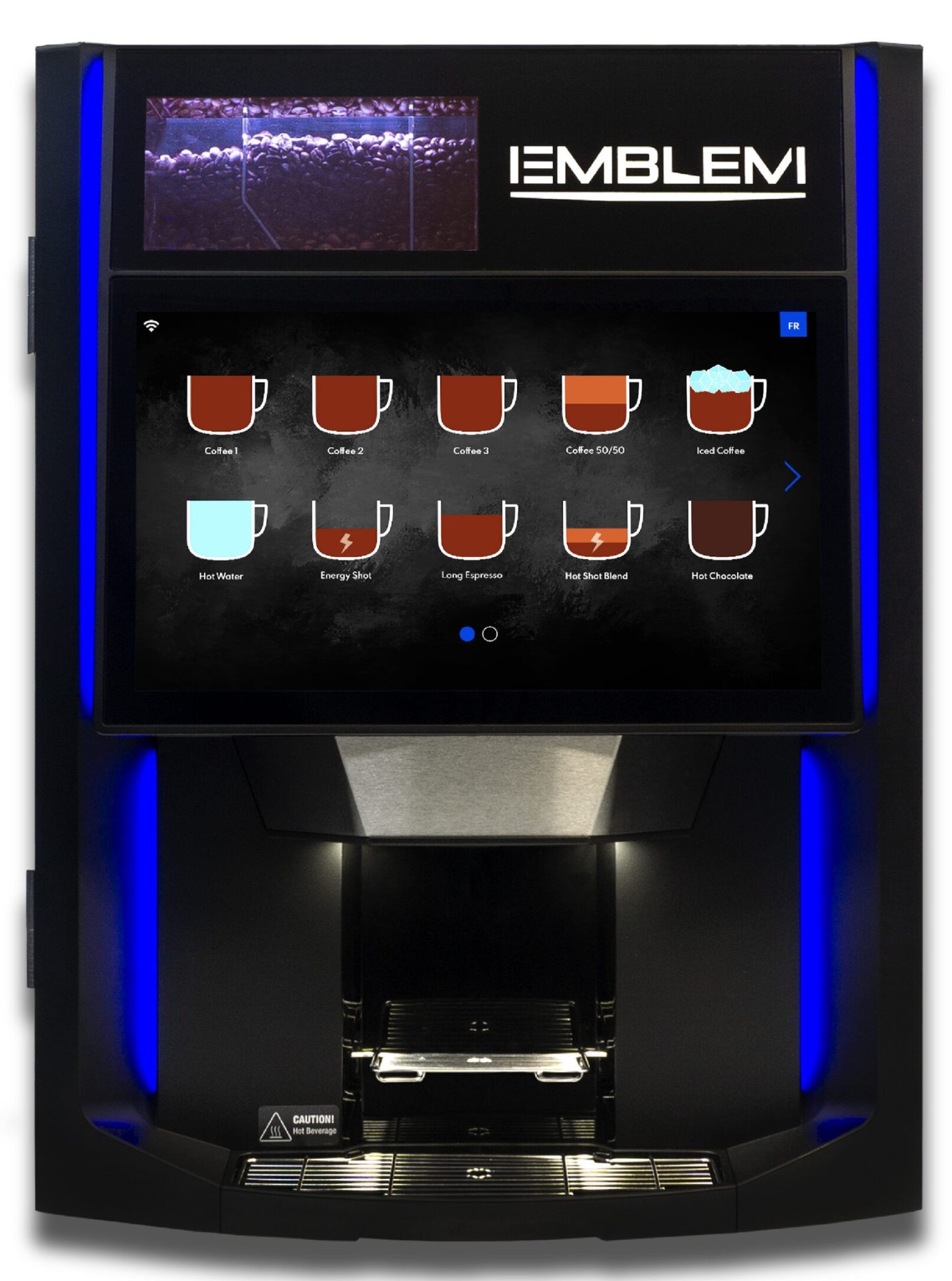 The Caféction Emblem Whole-Bean-to-Single-Cup Coffee Brewer delivers fresh-ground coffee in a single-serve format using three whole-bean hoppers and three soluble ingredient canisters. With this configuration, you can craft a variety of beverages including coffee, espresso, cappuccino, latte, mochaccino, and hot chocolate — all tailored for the enjoyment of your employees and patrons. It’s large 18.5-inch HD touchscreen interface allows users to easily personalize drink size, strength, and flavor.